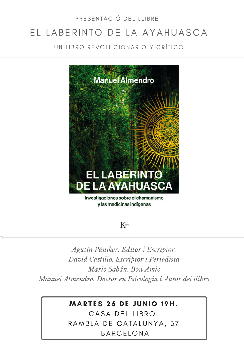 El martes 26 de junio a las 19h, en la Casa del Libro (Rambla de Catalunya, 37), tendrá lugar la presentación del último libro revolucionario y crítico de Manuel Almendro: El laberinto de la ayahuasca.