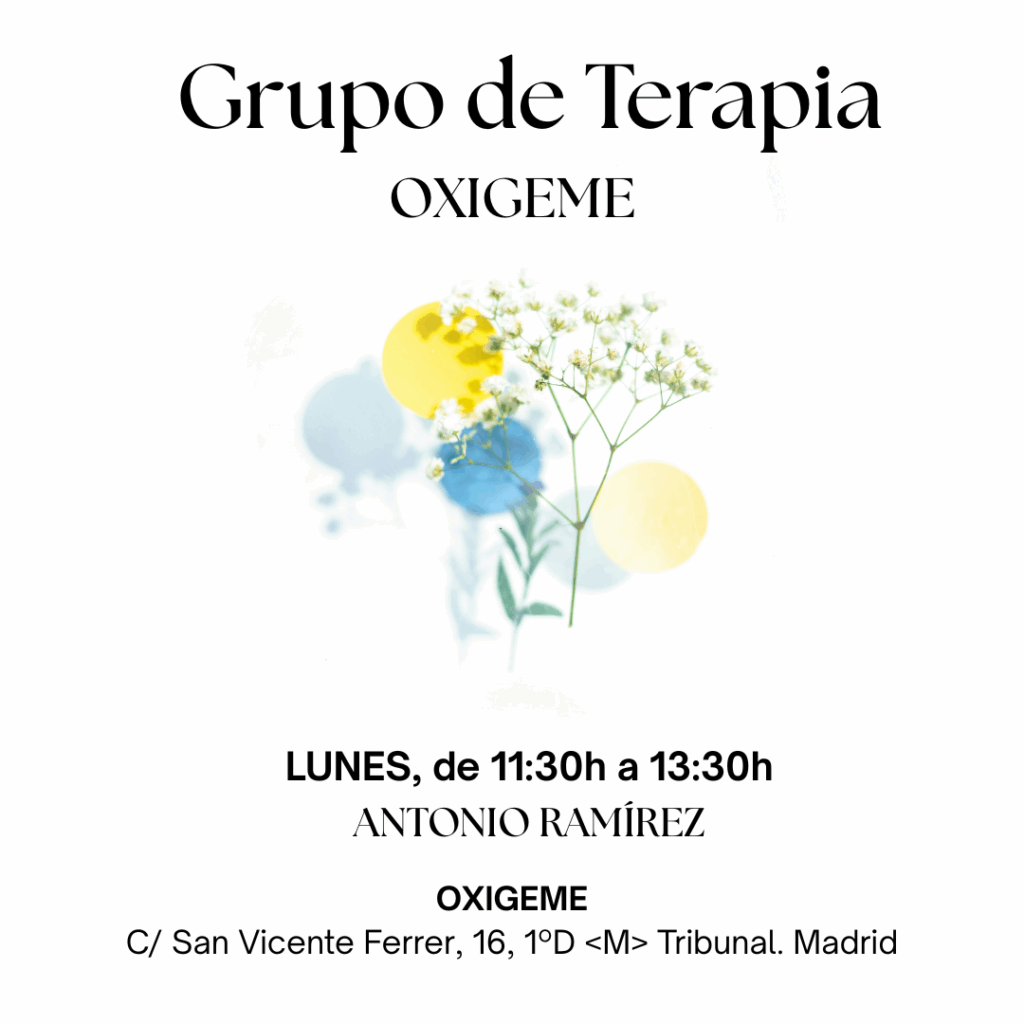 Se inicia un grupo de terapia con horario de mañana el primer lunes de Octubre en el centro Oxígeme de Tribunal (Madrid). El horario será todos los lunes, de 11:30 a 13:30h.
